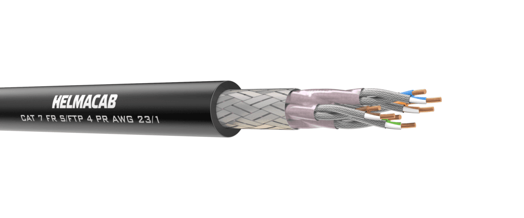 Shielded twisted pair (S/FTP) design with fire-resistant construction, compliant with IEC 60331-2 standards for circuit integrity during fire exposure. Offers superior protection against electromagnetic interference and signal attenuation. Aimed at applications where transmission of frequencies up to 600 MHz is required.
